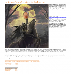 Last year, Arnold & Porter’s Retired Partner Philip Horton and Senior Associate Melissa Weberman built enthusiasm for a Halloween-themed “Trick-or-Treat for Justice” event. The team harnessed the power of email, Photoshop, and holiday spirit to get their colleagues involved. It was a HUGE success!